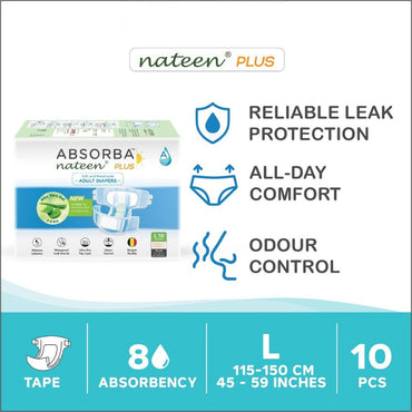 Premium Protection. Maximum Comfort. Trusted Care. Superior Care for Heavy Incontinence ABSORBA Nateen PLUS Adult Diapers are designed for bedridden, semi-mobile, or heavy incontinence users, providing...