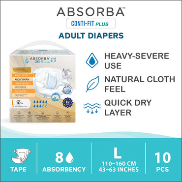 Maximum Absorbency. All-Day Comfort. Gentle on Skin. Trusted Protection for All-Day and Overnight Use Absorba ContiFit PLUS Adult Diapers are designed for heavy absorbency and long-wear...