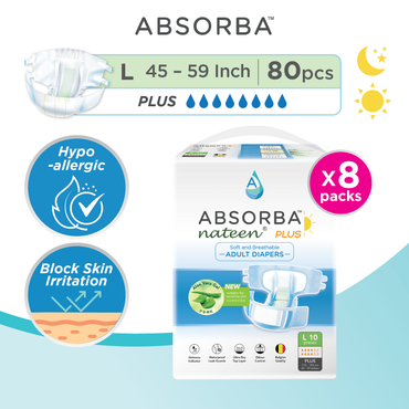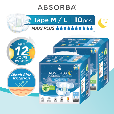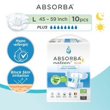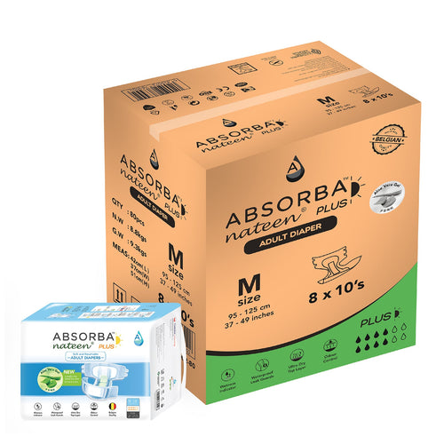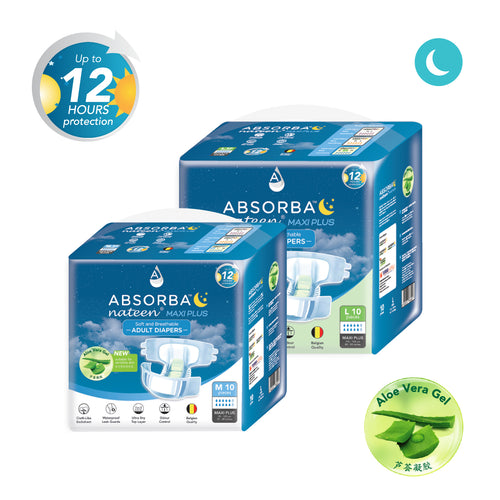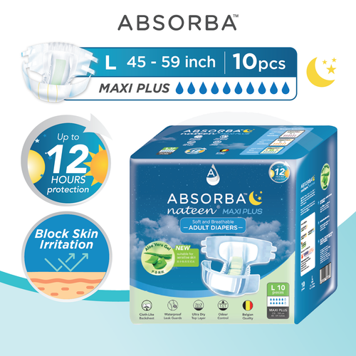 ABSORBA Nateen (Maxi Plus) Adult Diapers have Aloe Vera Gel for optimum comfort and are well-designed for maximum leakage protection. It is suitable for overnight use...