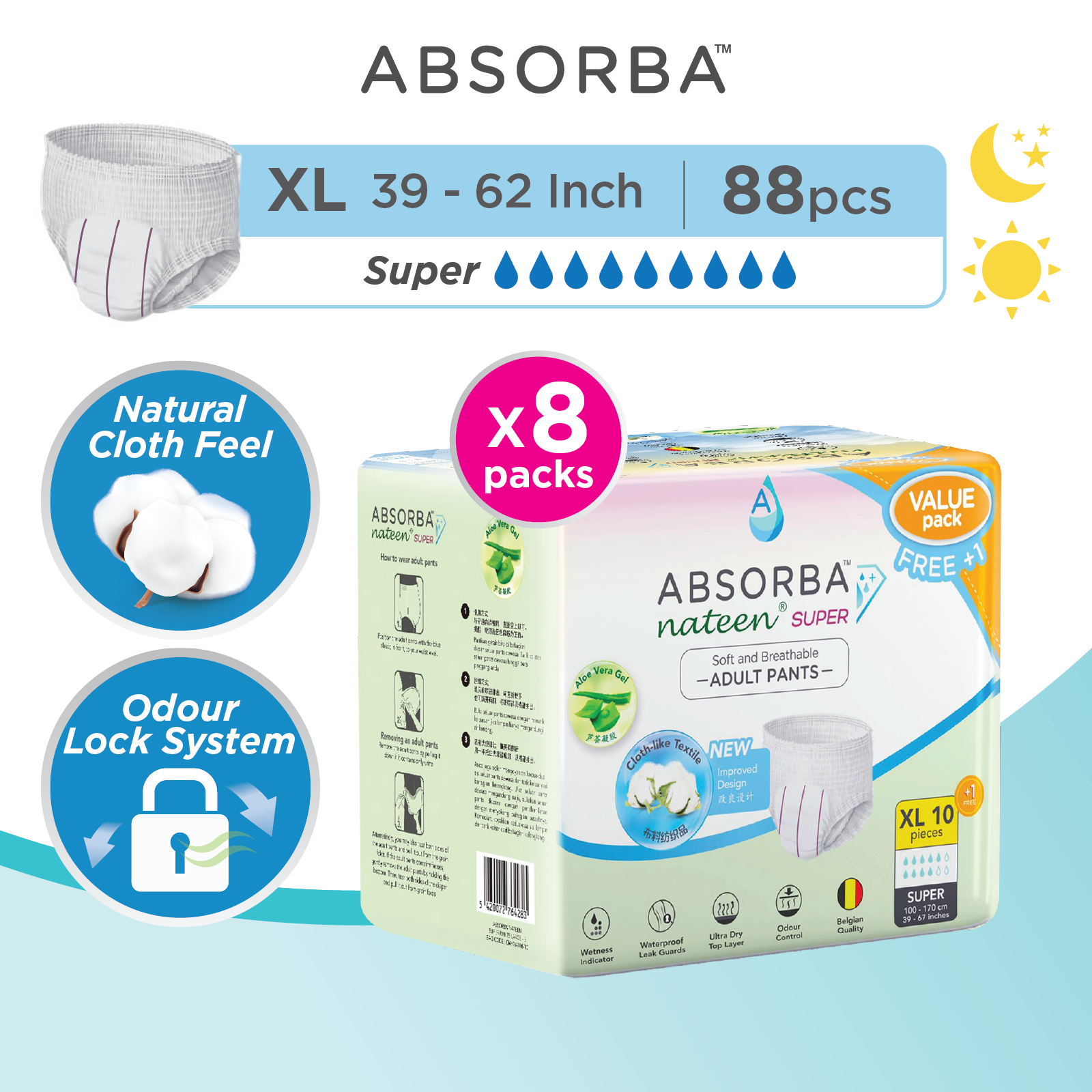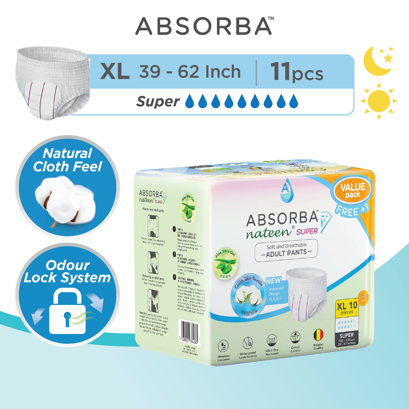 Absorba Nateen Adult Pants are premium Belgium-Quality incontinent pull up pants that provides you with multi-functional features and high absorbency performance.