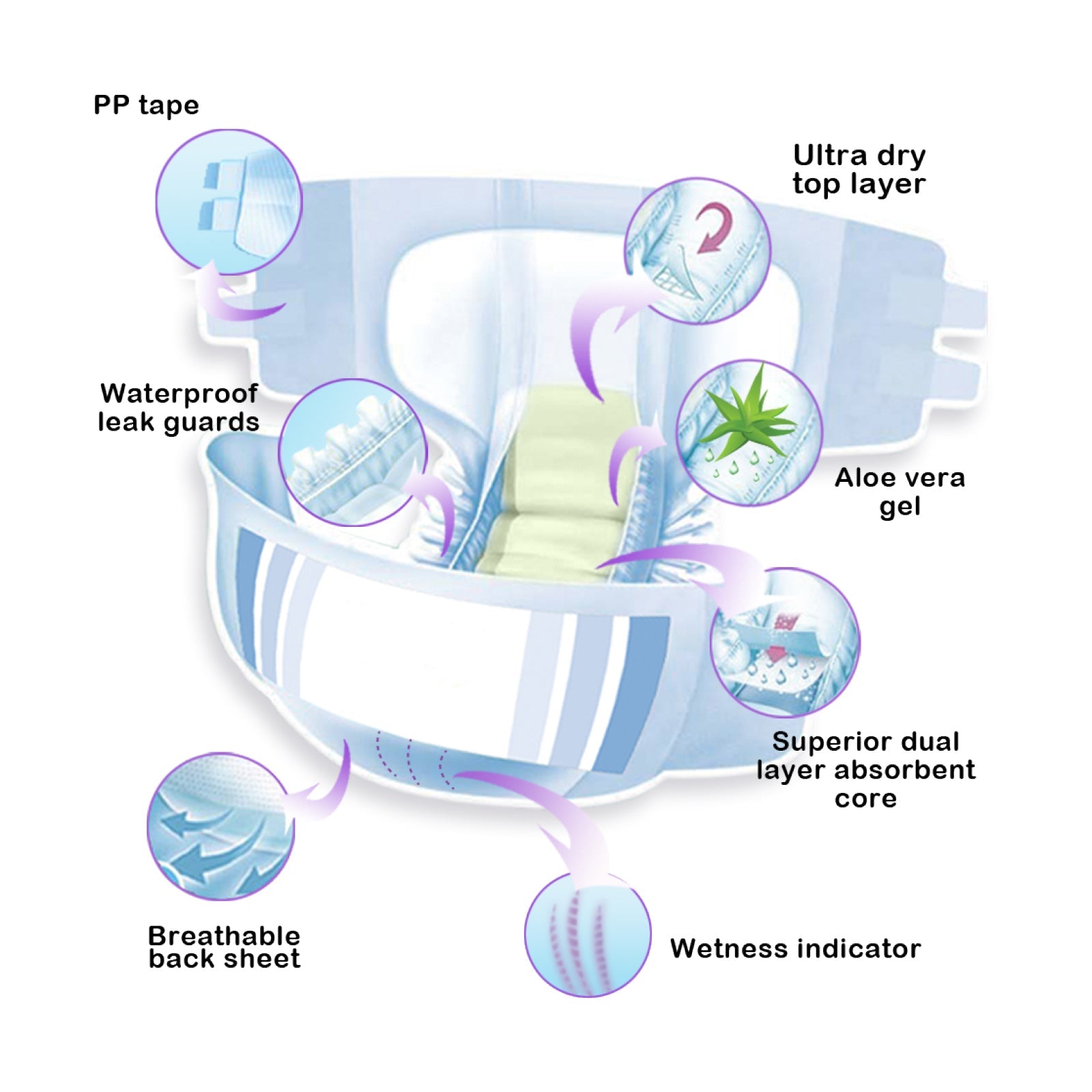 5) Specially included Breathable Backsheet for the aeration of skin and reducing humidity and heat.