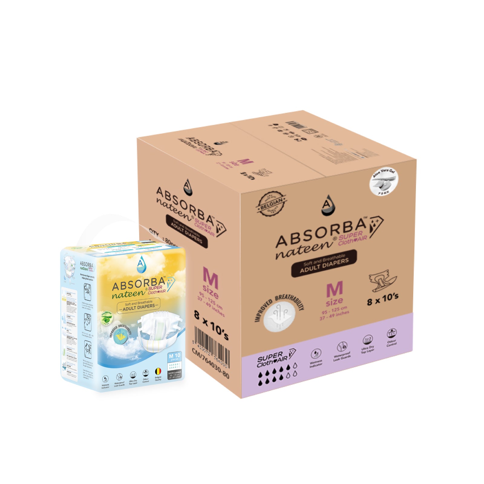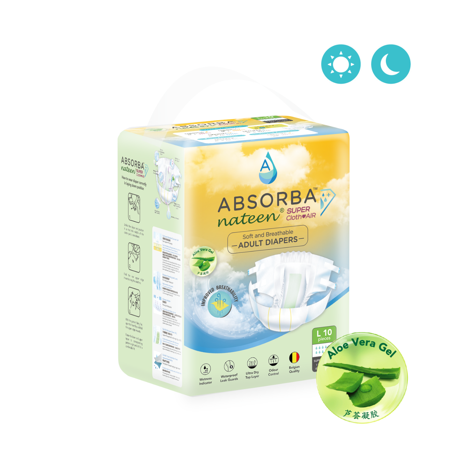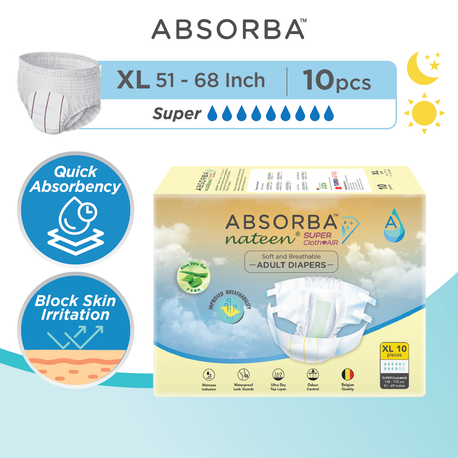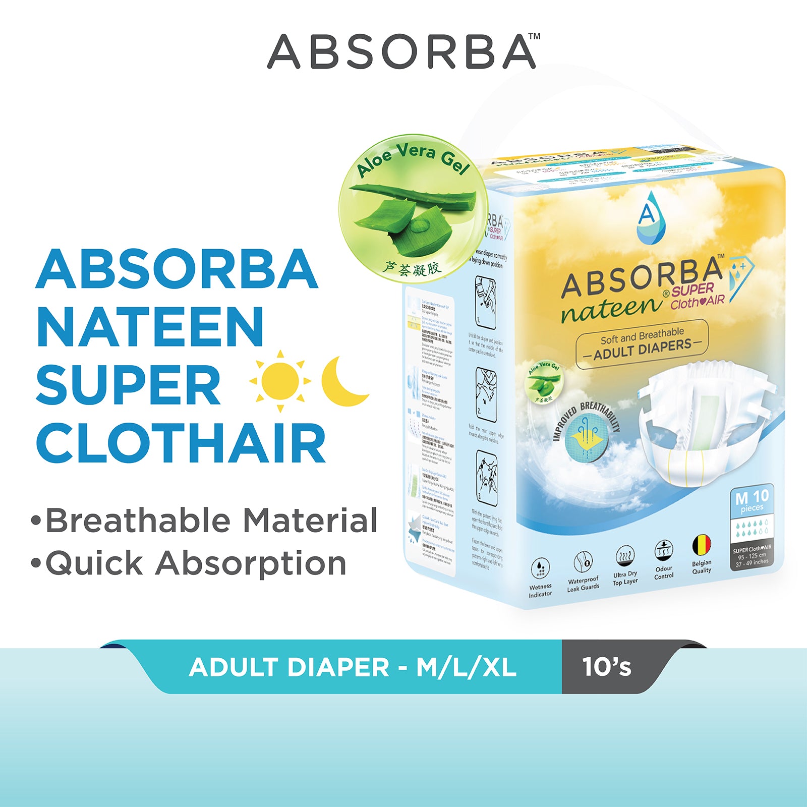 Absorba Nateen SUPER CLOTHAIR Adult Diapers are for moderate to heavy usage. Suitable for day and night.